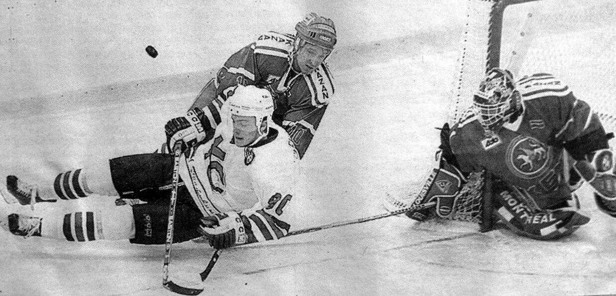 Сезон 2001/02. “Крылья Советов” – “АК Барс”. Нападающий «казанецев» Андрей Никитенко на лёд роняет Николая Ружейникова